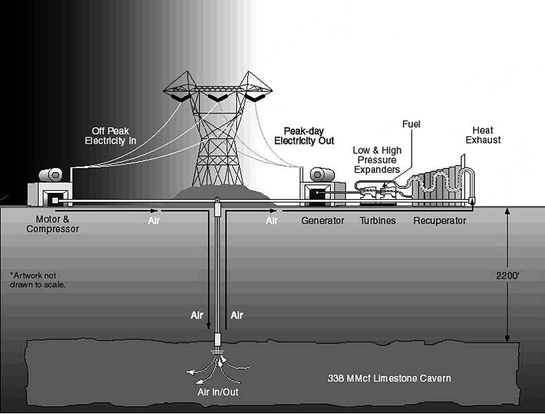This diagram demonstrates how compressed air storage would work. Most of these work on the same general idea: use extra energy to do work you can get energy out of later.